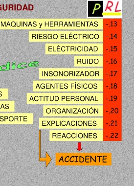 CONSEJOS PRÁCTICOS DE SEGURIDAD MAQUINAS y HERRAMIENTAS -.13 RIESGO ELÉCTRICO -.14 ELÉCTRICIDAD -.15 RUIDO -.16 2.- 3.- ORDEN Y LIMPIEZA INSONORIZADOR -.17 4.- INCENDIOS AGENTES FÍSICOS -.18 5.- 6.- MANEJO MANUAL DE CARGAS ACTITUD PERSONAL -.19 7.- CARGAS y POSICIONES FORZADAS ORGANIZACIÓN -.20 8.- EQUIPOS de ELEVACIÓN Y TRANSPORTE EXPLICACIONES -.21 9.- EQUIPOS DE ELEVACIÓN REACCIONES -.22 10.- MAQUINAS y HERRAMIENTAS 11.- GOLPES y CORTES ACCIDENTE 12.- HERRAMIENTAS de TRABAJO