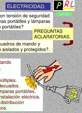 POSIBLES PELIGROS. ¿Se trabaja con tensión de seguridad CP-15 CONTACTO en las máquinas portátiles y lámparas ELÉCTRICO, directo de alumbrado portátiles? o indirecto con: PREGUNTAS Instalación eléctrica. ACLARATORIAS. Equipos eléctricos. Máquinas portátiles. ¿Están los cuadros de mando y Lámparas portátiles. cableado fijo aislados y protegidos?. • Proteger la instalación eléctrica montando elementos antideflagrantes en cuadro, cableado e interruptores. • Utilizar enrolladores con enchufes múltiples. • Proteger motores con disyuntores adecuados. • Utilizar tensión de seguridad para lámparas portátiles. • Puesta a tierra adecuada a toda la instalación eléctrica. • Proteger los cuadros generales y de distribución con disyuntores de potencia automáticos.