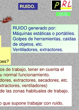 RUIDO. CP-16 RUIDO generado por: Máquinas estáticas o portátiles. PREGUNTAS Golpes de herramientas, caídas ACLARATORIAS. de objetos, etc. ¿Está el trabajador expuesto Ventiladores, extractores. frecuentemente a niveles de ruido elevado o a ruidos producidos por golpes? • Al comprar máquinas y demás equipos de trabajo, tener en cuenta el nivel de ruido que producen durante su normal funcionamiento. • Efectuar el mantenimiento de ventiladores, extractores, secadores, etc. • Aislar centros de emisión de ruido (extractores, ventiladores) instalandolos lo más alejados posible de las zonas habituales de trabajo. • Utilizar los EPIs contra el ruido. • Informar a los trabajadores del riesgo que supone trabajar con ruido.