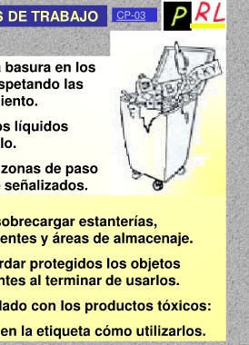 ORDEN Y LIMPIEZA EN LAS ÁREAS DE TRABAJO CP-03 - Colocar siempre los desechos y la basura en los recipientes destinados para ello, respetando las normas de etiquetado y almacenamiento. - No dejar objetos, ni permitir que los líquidos derramados permanezcan en el suelo. - Mantener los pasillos, escaleras y zonas de paso libres de obstáculos y debidamente señalizados. - No sobrecargar estanterías, recipientes y áreas de almacenaje. - Guardar protegidos los objetos cortantes al terminar de usarlos. - Cuidado con los productos tóxicos: Mirar en la etiqueta cómo utilizarlos.