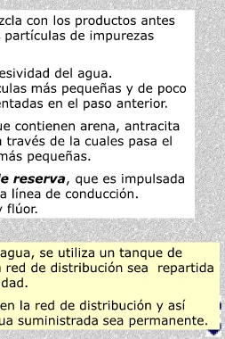 Floculación: donde el agua se mezcla con los productos antes mencionados, los que recogen las partículas de impurezas presentes en el agua. _ Ajuste de pH, para evitar la agresividad del agua. _ Filtración: Se retienen las partículas más pequeñas y de poco peso, que no pudieron ser sedimentadas en el paso anterior. Este proceso ocurre en filtros, que contienen arena, antracita y piedras de diferentes tamaños a través de la cuales pasa el agua y se retienen las partículas más pequeñas. El agua filtrada va a un tanque de reserva, que es impulsada por la estación de bombeo hacia la línea de conducción. En este punto se le agrega cloro y flúor. Para asegurar el suministro del agua, se utiliza un tanque de reserva, para que a través de la red de distribución sea repartida a los diferentes puntos de la ciudad. Se realiza Control de Calidad en la red de distribución y así garantizar que la calidad del agua suministrada sea permanente.
