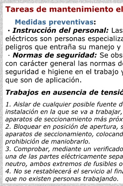 Medidas preventivas: · Nunca conecte un aparato mojado. · No sobrecargue los enchufes. · Las reparaciones las efectuará personal cualificado. · No realice empalmes provisionales. · Si observa cables pelados avise al encargado. · Antes de enchufar una máquina realice una inspección visual de los conductores. · La maniobra de enchufar o desenchufar se realizará por la clavija, no por el cable. · No deposite aparatos eléctricos en lugares de peligro, pueden averiarse por golpes, agua, etc. · Las puestas a tierra deben ser comprobadas, son su protección.