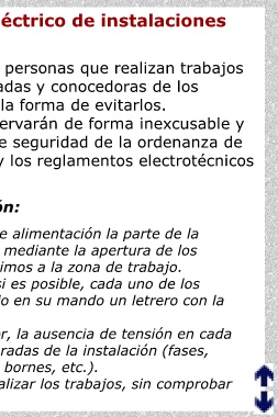Tareas de mantenimiento eléctrico de instalaciones Medidas preventivas: · Instrucción del personal: Las personas que realizan trabajos eléctricos son personas especializadas y conocedoras de los peligros que entraña su manejo y la forma de evitarlos. · Normas de seguridad: Se observarán de forma inexcusable y con carácter general las normas de seguridad de la ordenanza de seguridad e higiene en el trabajo y los reglamentos electrotécnicos que son de aplicación. Trabajos en ausencia de tensión: 1. Aislar de cualquier posible fuente de alimentación la parte de la instalación en la que se va a trabajar, mediante la apertura de los aparatos de seccionamiento más próximos a la zona de trabajo. 2. Bloquear en posición de apertura, si es posible, cada uno de los aparatos de seccionamiento, colocando en su mando un letrero con la prohibición de maniobrarlo. 3. Comprobar, mediante un verificador, la ausencia de tensión en cada una de las partes eléctricamente separadas de la instalación (fases, neutro, ambos extremos de fusibles o bornes, etc.). 4. No se restablecerá el servicio al finalizar los trabajos, sin comprobar que no existen personas trabajando.