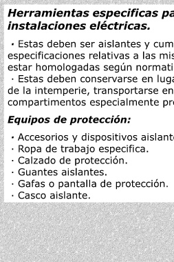 Tareas de mantenimiento eléctrico de instalaciones Medidas preventivas: · Instrucción del personal: Las personas que realizan trabajos eléctricos son personas especializadas y conocedoras de los peligros que entraña su manejo y la forma de evitarlos. · Normas de seguridad: Se observarán de forma inexcusable y con carácter general las normas de seguridad de la ordenanza de seguridad e higiene en el trabajo y los reglamentos electrotécnicos que son de aplicación. Trabajos en ausencia de tensión: 1. Aislar de cualquier posible fuente de alimentación la parte de la instalación en la que se va a trabajar, mediante la apertura de los aparatos de seccionamiento más próximos a la zona de trabajo. 2. Bloquear en posición de apertura, si es posible, cada uno de los aparatos de seccionamiento, colocando en su mando un letrero con la prohibición de maniobrarlo. 3. Comprobar, mediante un verificador, la ausencia de tensión en cada una de las partes eléctricamente separadas de la instalación (fases, neutro, ambos extremos de fusibles o bornes, etc.). 4. No se restablecerá el servicio al finalizar los trabajos, sin comprobar que no existen personas trabajando.