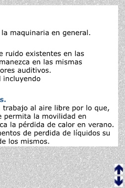 1.6. AMBIENTE FÍSICO 1.6.1. Ruido. El principal foco de este riesgo es la maquinaria en general. Medidas preventivas: · Debido a los elevados niveles de ruido existentes en las instalaciones, siempre que se permanezca en las mismas los trabajadores utilizarán protectores auditivos. · Realizar la vigilancia de la salud incluyendo protocolos para estas patologías. 1.6.2. Condiciones ambientales. Los operarios realizan parte de su trabajo al aire libre por lo que, debe utilizarse ropa de abrigo que permita la movilidad en invierno y ropa ligera que favorezca la pérdida de calor en verano. Asimismo es conveniente en momentos de perdida de líquidos su reposición mediante la ingestión de los mismos.