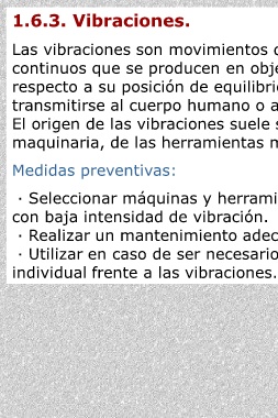 1.6. AMBIENTE FÍSICO 1.6.1. Ruido. El principal foco de este riesgo es la maquinaria en general. Medidas preventivas: · Debido a los elevados niveles de ruido existentes en las instalaciones, siempre que se permanezca en las mismas los trabajadores utilizarán protectores auditivos. · Realizar la vigilancia de la salud incluyendo protocolos para estas patologías. 1.6.2. Condiciones ambientales. Los operarios realizan parte de su trabajo al aire libre por lo que, debe utilizarse ropa de abrigo que permita la movilidad en invierno y ropa ligera que favorezca la pérdida de calor en verano. Asimismo es conveniente en momentos de perdida de líquidos su reposición mediante la ingestión de los mismos.