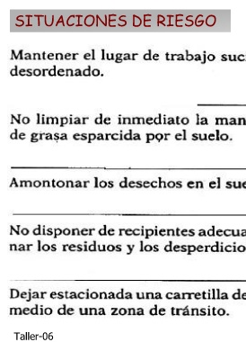 La caída no le originó más que algunas contusiones en el hombro y la cadera, pero fue el motivo para que, aunque tarde, los responsables del taller se decidieran a convocar una reunión con todos los trabajadores para planificar el orden y la limpieza del taller. En la reunión se trató también de otros riesgos para la seguridad en el trabajo y se propuso designar a un trabajador para encargarse de la prevención.