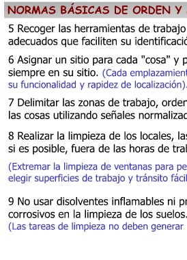 NORMAS BÁSICAS DE ORDEN Y LIMPIEZA 1 1 Establecer criterios para clasificar los materiales en función de su utilidad y para eliminar lo que no sirva. (Realizar una limpieza general y utilizar contenedores para la recogida de lo inservible). 2 Eliminar diariamente todos los desechos y cualquier otra clase de suciedad del suelo de las instalaciones, depositándolos en recipientes adecuados y colocados en los mismos lugares donde se generen los residuos. (Para desechos fácilmente inflamables, utilizar bidones metálicos con tapa para evitar la propagación de incendios). 3 Eliminar y controlar las causas que contribuyen a que los materiales o los residuos se acumulen. 4 Guardar adecuadamente el material y las herramientas de trabajo en función de quién, como, cuando y dónde ha de encontrar lo que busca; habituarse a poner cada cosa en su lugar y a eliminar lo que no sirve de manera inmediata.