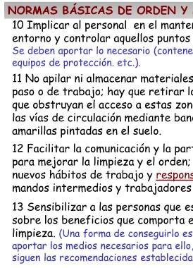 NORMAS BÁSICAS DE ORDEN Y LIMPIEZA 2 5 Recoger las herramientas de trabajo en soportes o estantes adecuados que faciliten su identificación y localización. 6 Asignar un sitio para cada "cosa" y procurar que cada "cosa" esté siempre en su sitio. (Cada emplazamiento estará concebido en razón de su funcionalidad y rapidez de localización). 7 Delimitar las zonas de trabajo, ordenar y marcar la ubicación de las cosas utilizando señales normalizadas y códigos de colores. 8 Realizar la limpieza de los locales, las máquinas, las ventanas, etc., si es posible, fuera de las horas de trabajo. (Extremar la limpieza de ventanas para permitir la entrada de luz natural y elegir superficies de trabajo y tránsito fácilmente lavables). 9 No usar disolventes inflamables ni productos corrosivos en la limpieza de los suelos. (Las tareas de limpieza no deben generar peligros).