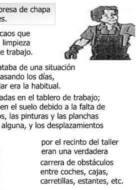 Antonio empezó a trabajar en una empresa de chapa y reparación de coches hace seis meses. Desde un principio, se dio cuenta del caos que reinaba en el taller en lo referente a la limpieza del local y al orden de los materiales de trabajo. Dejó transcurrir un tiempo por si se trataba de una situación esporádica, pero, a medida que iban pasando los días, constató que aquella manera de trabajar era la habitual. Las herramientas nunca estaban colocadas en el tablero de trabajo; los trapos sucios de grasa se apilaban en el suelo debido a la falta de recipientes para tirarlos; los neumáticos, las pinturas y las planchas estaban amontonados sin clasificación alguna, y los desplazamientos por el recinto del taller eran una verdadera carrera de obstáculos entre coches, cajas, carretillas, estantes, etc.