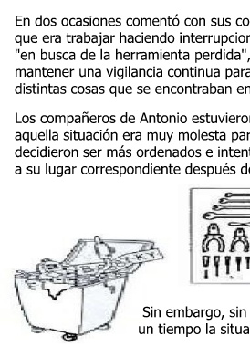 Antonio empezó a trabajar en una empresa de chapa y reparación de coches hace seis meses. Desde un principio, se dio cuenta del caos que reinaba en el taller en lo referente a la limpieza del local y al orden de los materiales de trabajo. Dejó transcurrir un tiempo por si se trataba de una situación esporádica, pero, a medida que iban pasando los días, constató que aquella manera de trabajar era la habitual. Las herramientas nunca estaban colocadas en el tablero de trabajo; los trapos sucios de grasa se apilaban en el suelo debido a la falta de recipientes para tirarlos; los neumáticos, las pinturas y las planchas estaban amontonados sin clasificación alguna, y los desplazamientos por el recinto del taller eran una verdadera carrera de obstáculos entre coches, cajas, carretillas, estantes, etc.