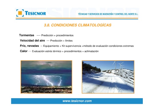 Equipamiento + Kit supervivencia +método de evaluación condiciones extremas 3.8. CONDICIONES CLIMATOLOGÍCAS www.tesicnor.com Predicción + procedimientos Predicción + límites Evaluación estrés térmico + procedimientos + aclimatación --- ---- -- Tormentas Velocidad del aire Frío, nevadas --- Calor