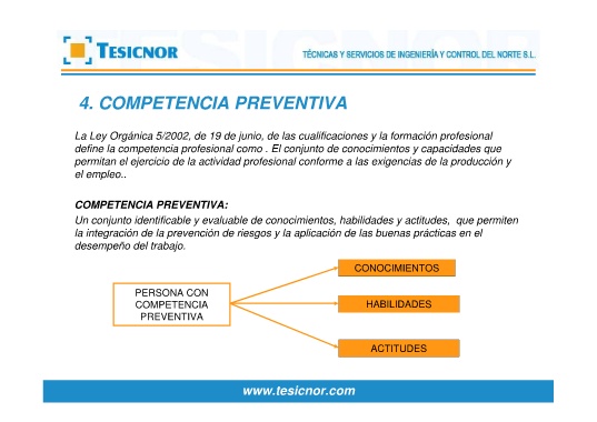 Un conjunto identificable y evaluable de conocimientos, habilidades y actitudes, que permiten exigencias de la producción y define la competencia profesional como . El conjunto de conocimientos y capacidades que La Ley Orgánica 5/2002, de 19 de junio, de las cualificaciones y la formación profesional la integración de la prevención de riesgos y la aplicación de las buenas prácticas en el CONOCIMIENTOS HABILIDADES ACTITUDES permitan el ejercicio de la actividad profesional conforme a las www.tesicnor.com 4. COMPETENCIA PREVENTIVA COMPETENCIA PREVENTIVA: desempeño del trabajo. PERSONA CON COMPETENCIA PREVENTIVA el empleo..