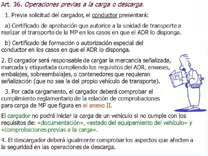 MERCANCIAS PELIGROSAS 43 Ley 15-09; mercancías peligrosas RD97-2014 MERCANCIAS PELIGROSAS 44 Ley 15-2009; Contenido de la Carta de Porte RD97-2014 MERCANCIAS PELIGROSAS 45 Ley 15-2009; Documentación mercancía RD97-2014
