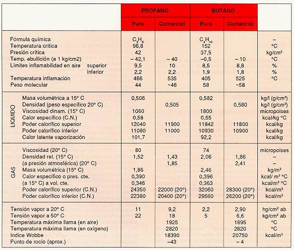 Los G.L.P. comerciales no son productos puros, sino mezclas de butano y propano con otros hidrocarburos. Las propiedades fisicoquímicas del propano y el butano se dan en la Tabla 1.