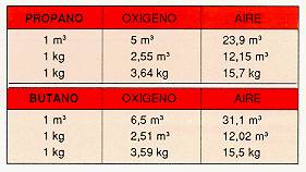 Para la perfecta combustión del butano y del propano se necesitan las siguientes cantidades de aire o de oxígeno.