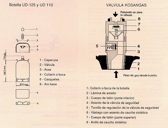 La válvula Kosangas está formada por un cuerpo de latón que contiene un órgano de cierre roscado al collarín de la botella. Esta válvula tiene como función el llenado de la botella en las plantas y el acoplamiento del regulador para el consumo del gas. Cuando el regulador no se encuentra acoplado, la válvula permanece siempre cerrada.