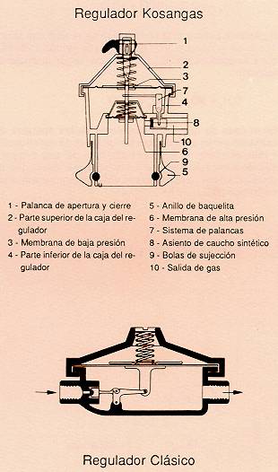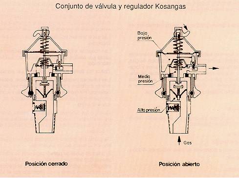 La presión de salida se mantiene prácticamente constante siempre que el consumo no exceda de 3 kg/hora. En el gráfico se representan los valores de los caudales y presiones reales de salida del regulador Kosangas de 30 g/cm2. En su parte superior, el regulador lleva una palanca para abrir y cerrar el paso de gas.