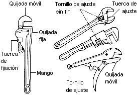 Las llaves de boca ajustables son herramientas manuales diseñadas para ejercer esfuerzos de torsión, con la particularidad de que pueden variar la abertura de sus quijadas en función del tamaño de la tuerca a apretar o desapretar. Los distintos tipos y sus partes principales son: mango, tuerca de fijación, quijada móvil, quijada fija y tornillo de ajuste. (Fig. 4)
