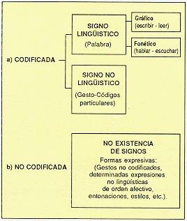 Indicaremos que esta división es puramente formal y que en la práctica comunicativa suelen darse simultáneamente tanto una como otra, es decir: "hablarnos" usando signos codificados, pero utilizando una entonación particular, un "tono" de comunicación, una gesticulación propia de cada comunicante, etc. simultáneamente a la emisión de los signos.