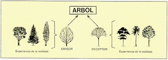 Las experiencias particulares del emisor sobre los árboles, (fig. 1) por poner un ejemplo, determinan, como ya decíamos, un "denominador común" del concepto "árbol" que sin duda será diferente del originado por el receptor, dado que las experiencias de éste son forzosamente diferentes de las del primero. A pesar de ello, el código sólo dispone de una palabra tanto para uno como para otro.