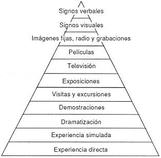 Para resumir lo dicho, podríamos hacer referencia al "cono de la experiencia" de Dole en el cual se citan las diversas posibilidades comunicativas que se dan en una situación de enseñanza, jerarquizadas según el aporte semático y el aumento progresivo de acercamiento a la total comprensión de emisor y receptor.