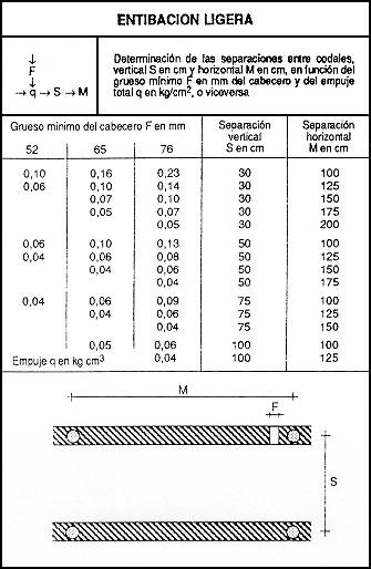 La Norma Tecnológica NTE-ADZ/1976 permite determinar su empleo en función de la profundidad de excavación, del tipo de terreno y de que exista solicitación de cimentación o vial (Tabla 6), mediante las tablas nº 7, 8, 9, 10, 11, 12 puede determinarse la separación y grosores de los distintos elementos que constituyen la entibación de los principales casos.