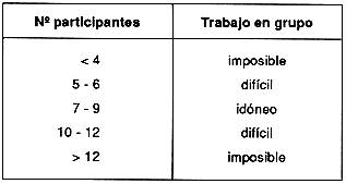 Siguiendo las leyes de la dinámica de grupos podemos establecer el tamaño adecuado para llevar a cabo una reunión de discusión. Podemos resumirlo en el siguiente esquema: