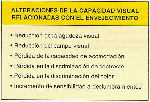El envejecimiento del sistema visual implica cambios en la óptica ocular y alteraciones en el sistema nervioso visual (tabla 1). A pesar de que la mayoría de las personas no tienen problemas visuales severos, sí sufren un deterioro suficiente como para que la ejecución de las tareas se vea alterada en alguna medida.