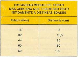 La acomodación es la capacidad del ojo para enfocar objetos cercanos y lejanos, es decir, para ajustar, de forma espontánea, la distancia focal del cristalino del ojo. Con el transcurso de los años se va alejando el punto más cercano de acomodación (tabla 2) y se pierde velocidad de acomodación. Como consecuencia, la gente mayor tiene problemas para leer sin gafas. A esta pérdida de la capacidad de enfocar los objetos cercanos, producida por la edad, se denomina presbyopía. Además, la capacidad de acomodación, más débil en los adultos que en los jóvenes, se degrada también más en el transcurso de la jornada laboral, debido a que es un proceso básicamente muscular en el que intervienen los músculos ciliares sobre el cristalino y sobre el iris y que, por tanto, está sometido a los procesos de fatiga muscular.