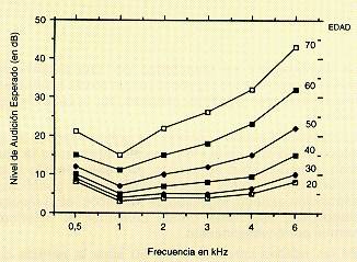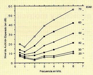 El proceso de envejecimiento afecta en primera instancia a los tonos altos, siendo las pérdidas de audición mayores para las frecuencias de 4000 Hz que en las de 1000 y 2000 Hz.