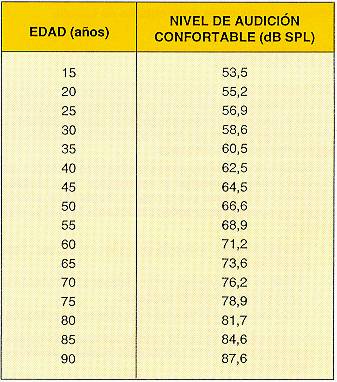 A medida que la edad del receptor se incrementa, también lo hace lentamente la intensidad del sonido que se precisa para lograr un nivel de audición confortable. Entre las edades de 15 y 39 años, el incremento anual del MCLL es de 0,335 dB anuales, es decir, de 1,8 dB cada cinco años. La tasa de incremento del MCLL aumenta de manera uniforme; a partir de 65 años el incremento medio anual es de 0,56 dB por año (de 2,8 dB cada cinco años).