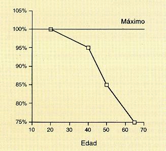 La capacidad musculoesquelética muestra importantes cambios durante el transcurso de los años. Se considera que la fuerza muscular alcanza sus máximos valores a finales de la veintena, comenzando, a partir de aquí, a reducirse paulatinamente, pudiendo llegar a significar el decremento de la fuerza muscular un 25% a los 60 años respecto a los 20 años. Como muestra la figura 5, se estima que su valor es del 95% del máximo a los 40 años, de un 85% a los 50 años y de un 75% a los 65 años.