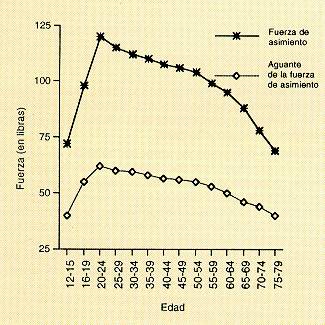 La fortaleza de asimiento de la mano muestra decrementos anuales, según estudios, que oscilan del 0'5% al 11%, habiendo confirmado esta última tasa distintos estudios (Viitasalo y Nygard).