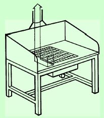 | La mesa con aspiración descendente consiste en una mesa con una parrilla en la parte superior. El aire es aspirado hacia abajo a través de la parrilla hacia el conducto de evacuación. La velocidad del aire debe ser suficiente para que los vapores y los gases no contaminen el aire respirado. Las piezas no deben ser demasiado grandes para no cubrir completamente el conducto e impedir el efecto de extracción. Fig. 6: Sistema de extracción mediante banco con aspiración ascendente | |
